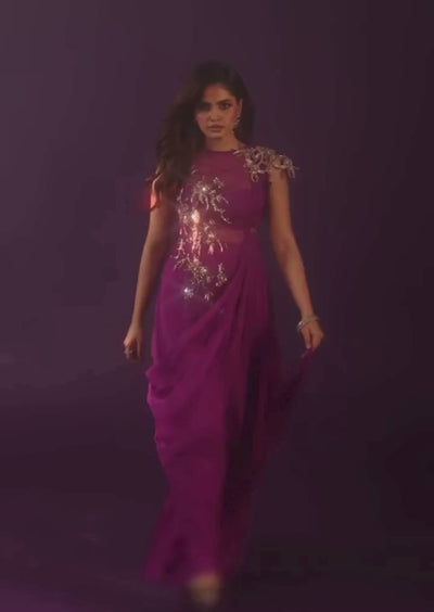 The silhouette is enhanced by a contemporary cut with sheer embellishments, making it the ideal statement piece for evening formal wear.