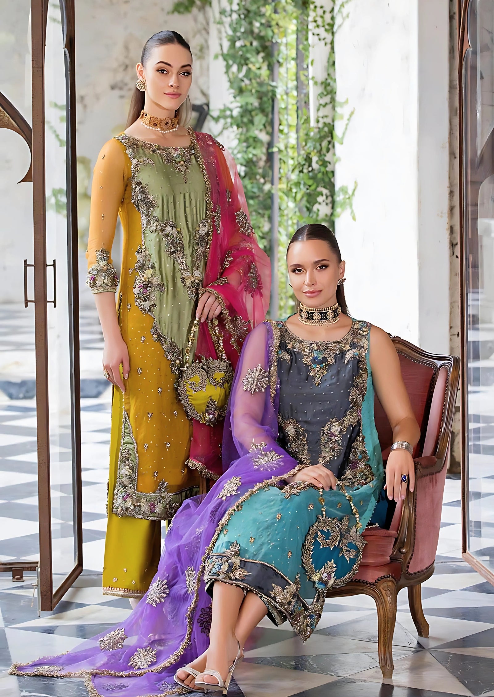 ✨ Crafted in vivid hues that exude festive charm, Royal Shine is a symphony of tradition and splendor. The ensemble has a flowing style that exudes regal grandeur, sparkling embellishments, and delicate hand stitching. It captures the essence of festivity when paired with a striking dupatta in contrasting hues; it's ideal for weddings, soirées, and classic get-togethers.