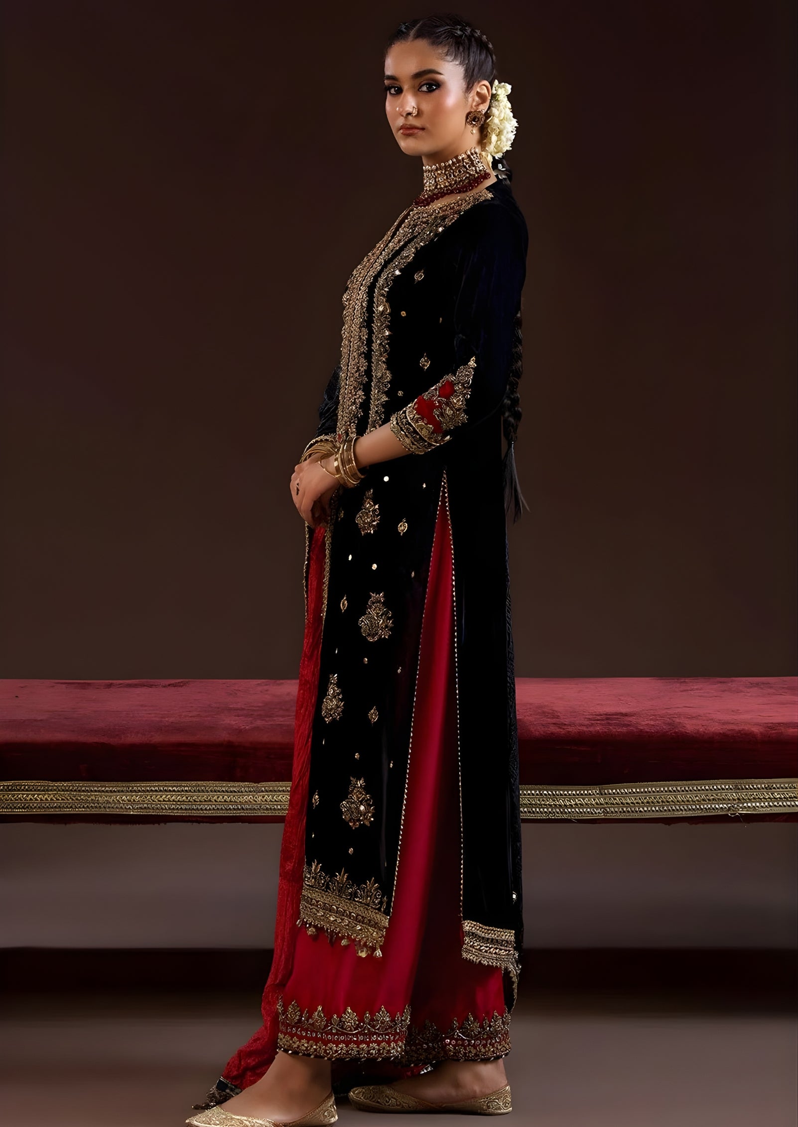 - Shirt: Velvet (imported) with Kora, Dabka, and Zardozi work (Hand-embroidered)